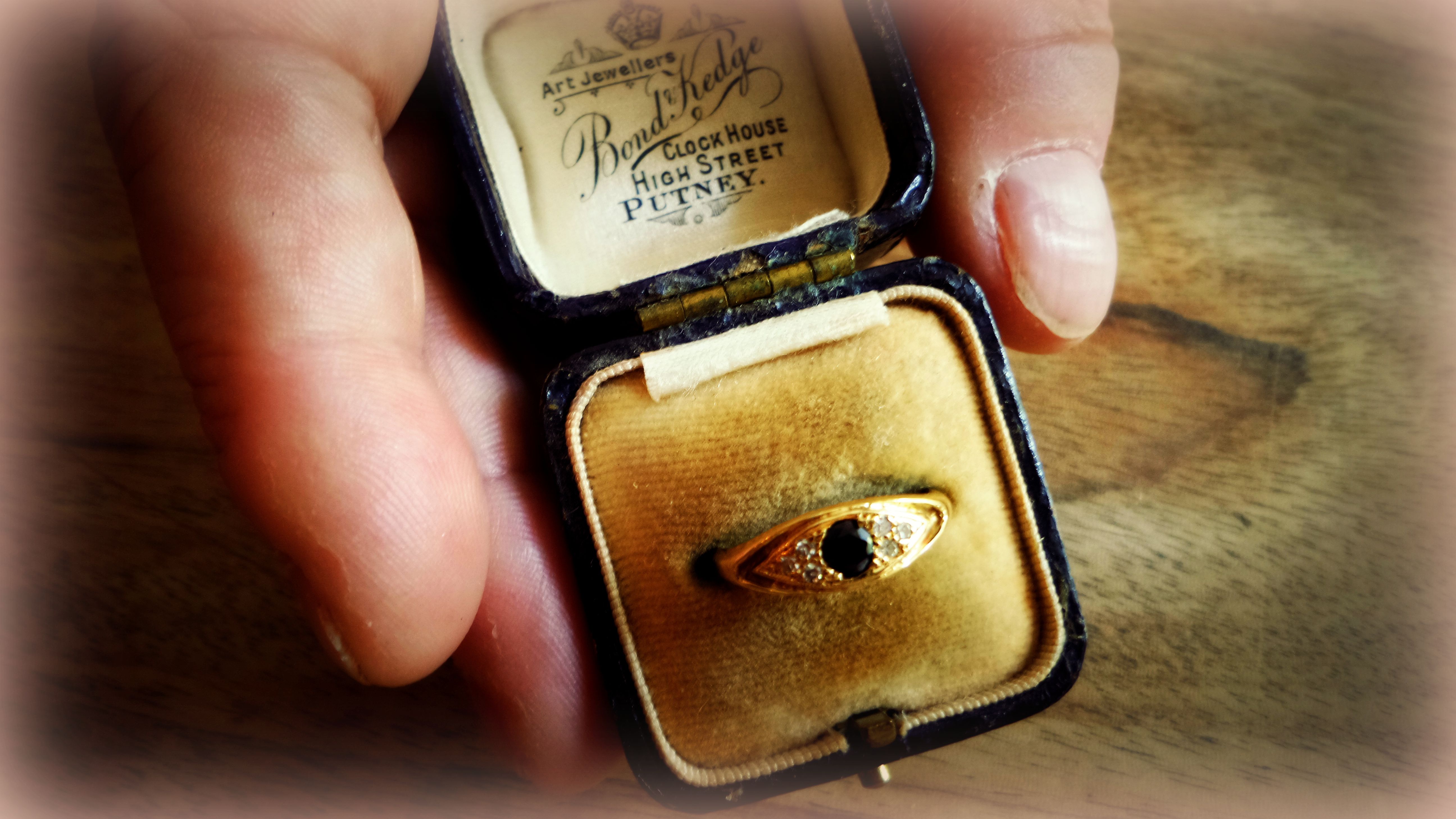 This plain and simple ring with its eye of sapphire and small smattering of diamonds was one I’d loved as we’d browsed jewellery shops together and he’d remembered before parting with his impoverished student cash.