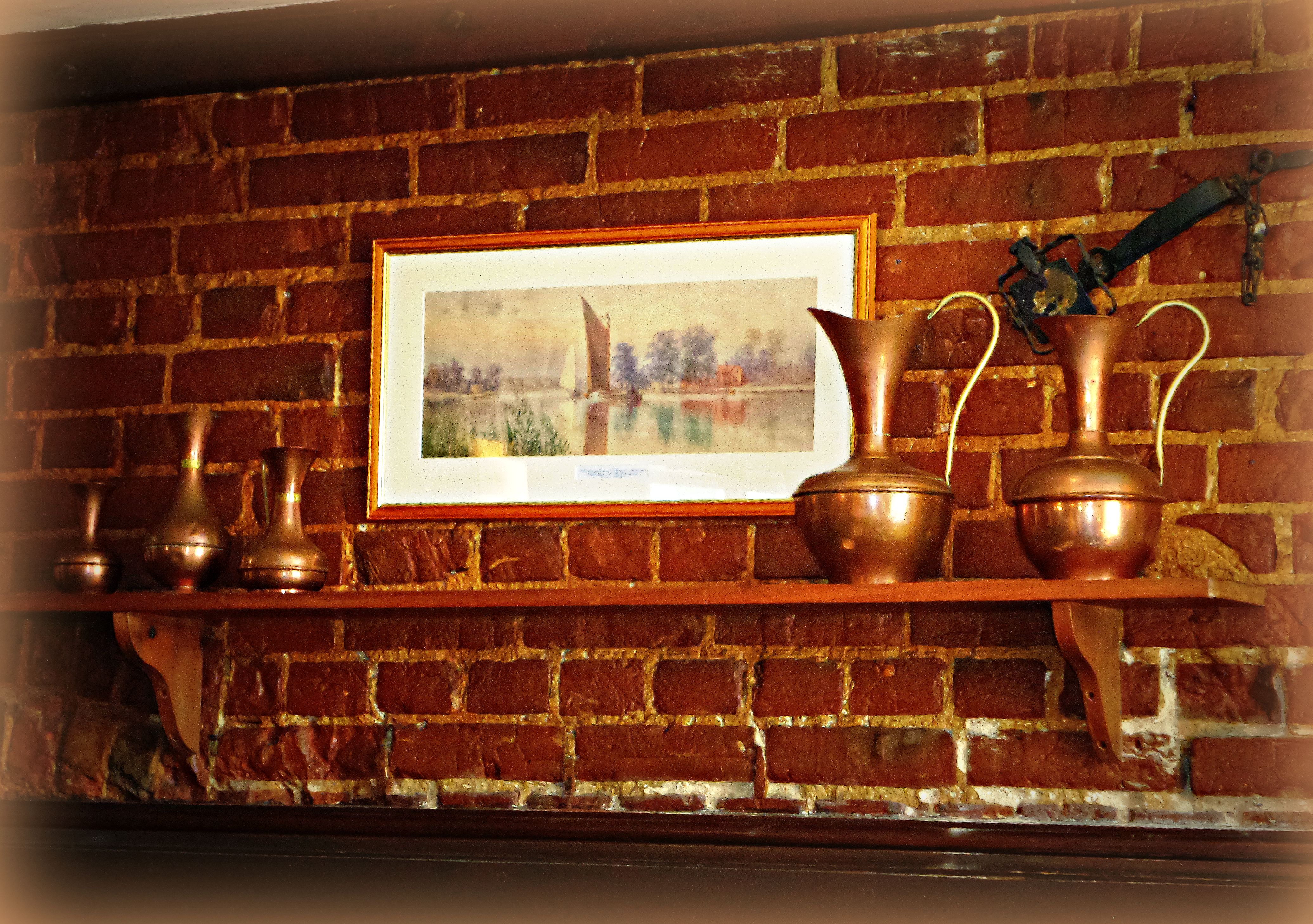 Exposed brickwork, chalkboard menus, wooden beams, copper jugs and pans all a part of its quaint English hostelry charm.