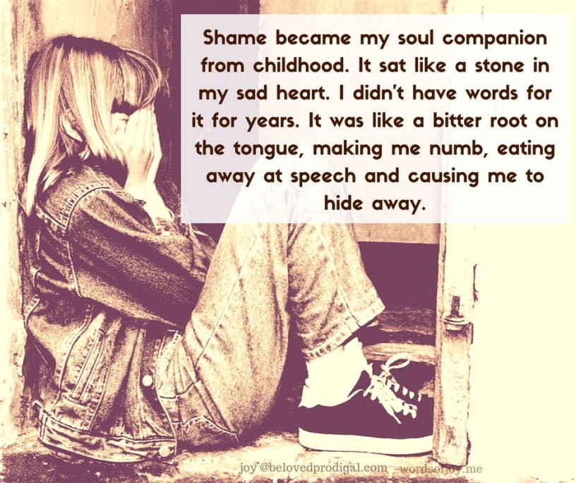 Shame became my soul companion from childhood. It sat like a stone in my sad heart. I didn’t have words for it for years. It was like a bitter root on the tongue, making me numb, eating away at speech and causing me to hide away.