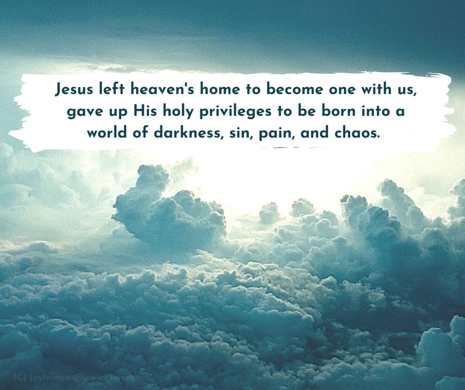 Jesus left heaven’s home to become one with us, gave up His holy privileges to be born into a world of darkness, sin, pain, and chaos. He opens His home to the wounded, the broken, and lost, to all who need saving from themselves. People just like you and me, in fact.