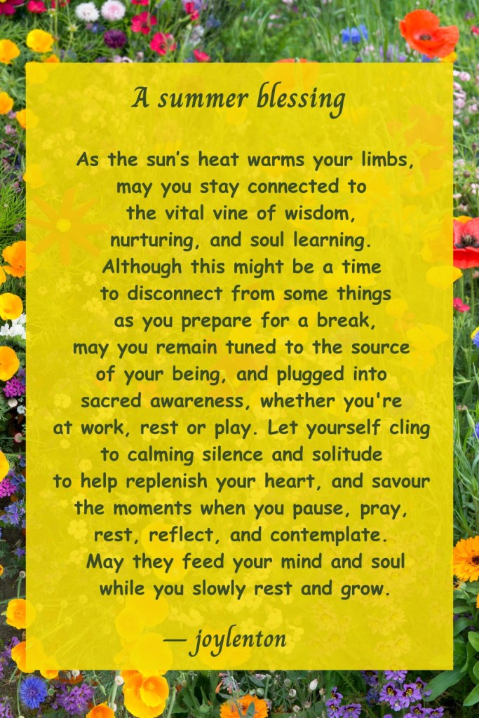 Dear Bettie, it was a joyful task compiling this list of (hopefully) inspiring and encouraging resources! I hoped there would be enough variety to appeal to someone who reads this post. Summertime lends itself well to a lighter look at life, including soul care activities whereby we seek to be refreshed, recharged, rested, and at peace. Writing the blessing prayer was a blessing to me, and more so as I read it over again. Sending love and hugs to you, too, dear friend, and prayers for deep soul replenishment, comfort, and peace in these more laidback summer days. Xx 🤗💟🌺🕊
